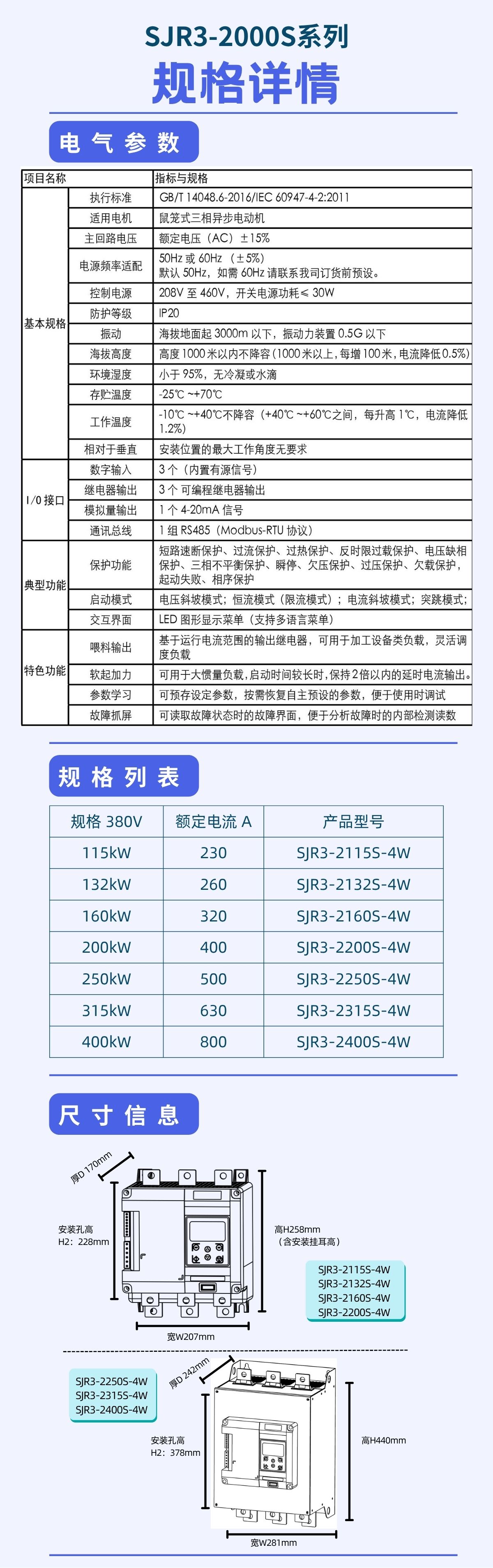 SJR3-2000S是Vsport公司最新研发的超紧凑软启动器,针对紧凑的车载(履带式)电柜 / 防爆电箱 / 壁挂基业箱 提出高密度电气解决方案,兼容在线式应用的同时兼备有外置旁路连接方式,增加了欠载,运行次数,运行时间,线性的温度监控等多种功能,内置集成了RS485通讯总线,提供多语种菜单。